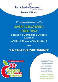 Nell’ambito della 33^ Sagra della Mela e dell’Uva in programma a Villa di Tirano nel fine settimana, sarà realizzato dalla Sezione di Tirano di Confartigianato Imprese Sondrio uno spazio espositivo dedicato al comparto artigiano (manifatturiero e di servizio) denominato “LA CASA DELL’ARTIGIANO”.
