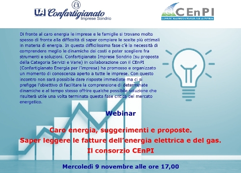Confartigianato Imprese Sondrio (su proposta della Categoria Servizi e Varie) in collaborazione con il consorzio d’acquisto CEnPI (Confartigianato Energia per l’impresa) ha promosso e organizzato un momento di conoscenza aperto a tutte le imprese. Con questo incontro non sarà possibile dare risposte immediate ma ci si prefigge l’obiettivo di facilitare la comprensione delle diverse componenti di costo e al tempo stesso offrire qualche possibile soluzione che risulterà utile una volta terminata questa fase critica del mercato energetico.