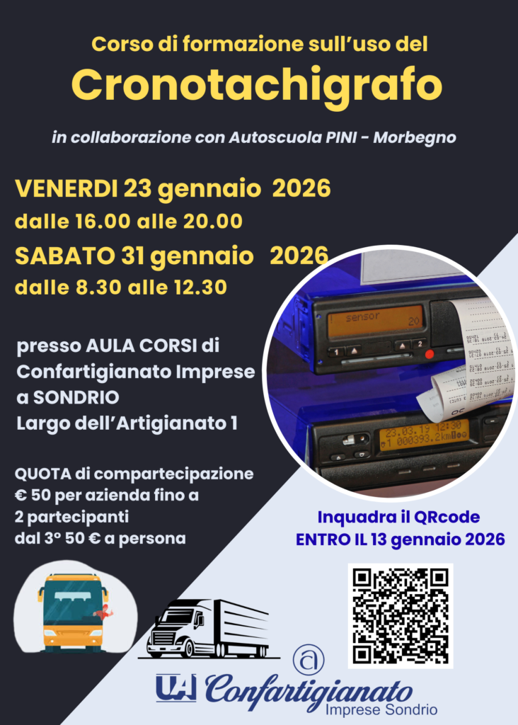 Confartigianato Imprese Sondrio, in collaborazione con l’Autoscuola PINI di Morbegno, organizza due giornate di formazione dedicate all’utilizzo corretto del cronotachigrafo. Un’occasione utile e concreta per aggiornarsi su uno strumento essenziale per la sicurezza e la regolarità del lavoro nel settore dell’autotrasporto.