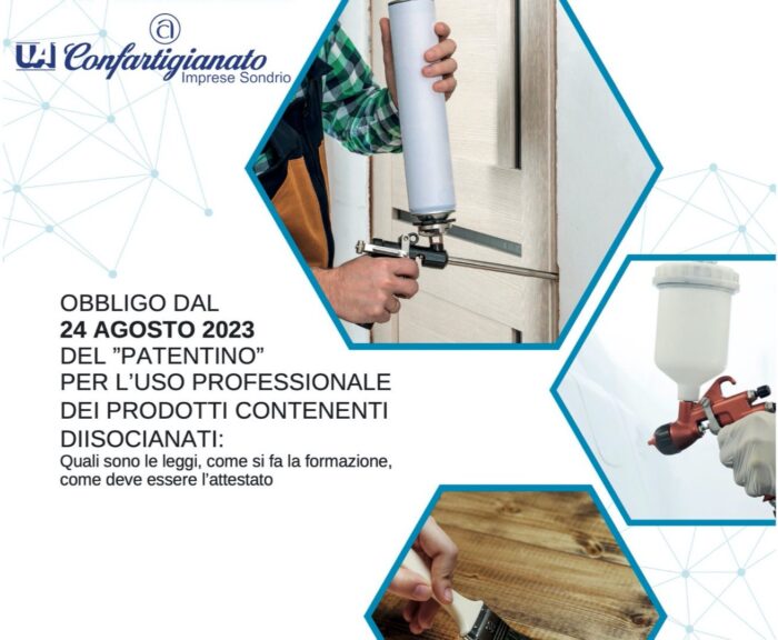 A partire dal 24 agosto 2023 vige l’obbligo di ‘patentino’ per chi usa le schiume poliuretaniche o prodotti contenenti diisocianati. In vista di tale scadenza la Tua associazione ha stretto un accordo con l’Accademia di formazione Ambrosi Partner e QSA srl, soggetto formatore accreditato, per un corso ed un esame per l’uso professionale delle schiume poliuretaniche, colle e vernici contenenti diisocianati.