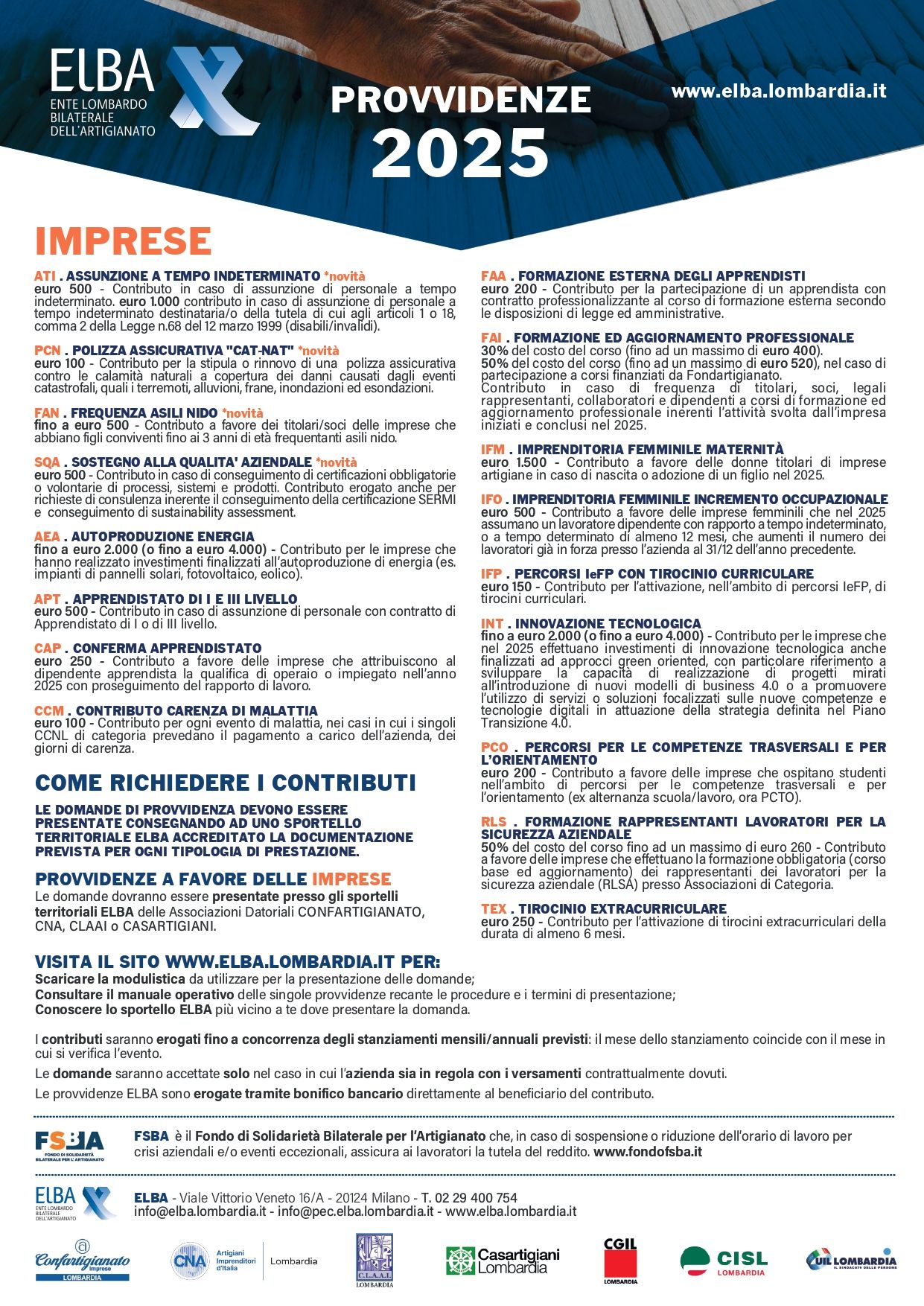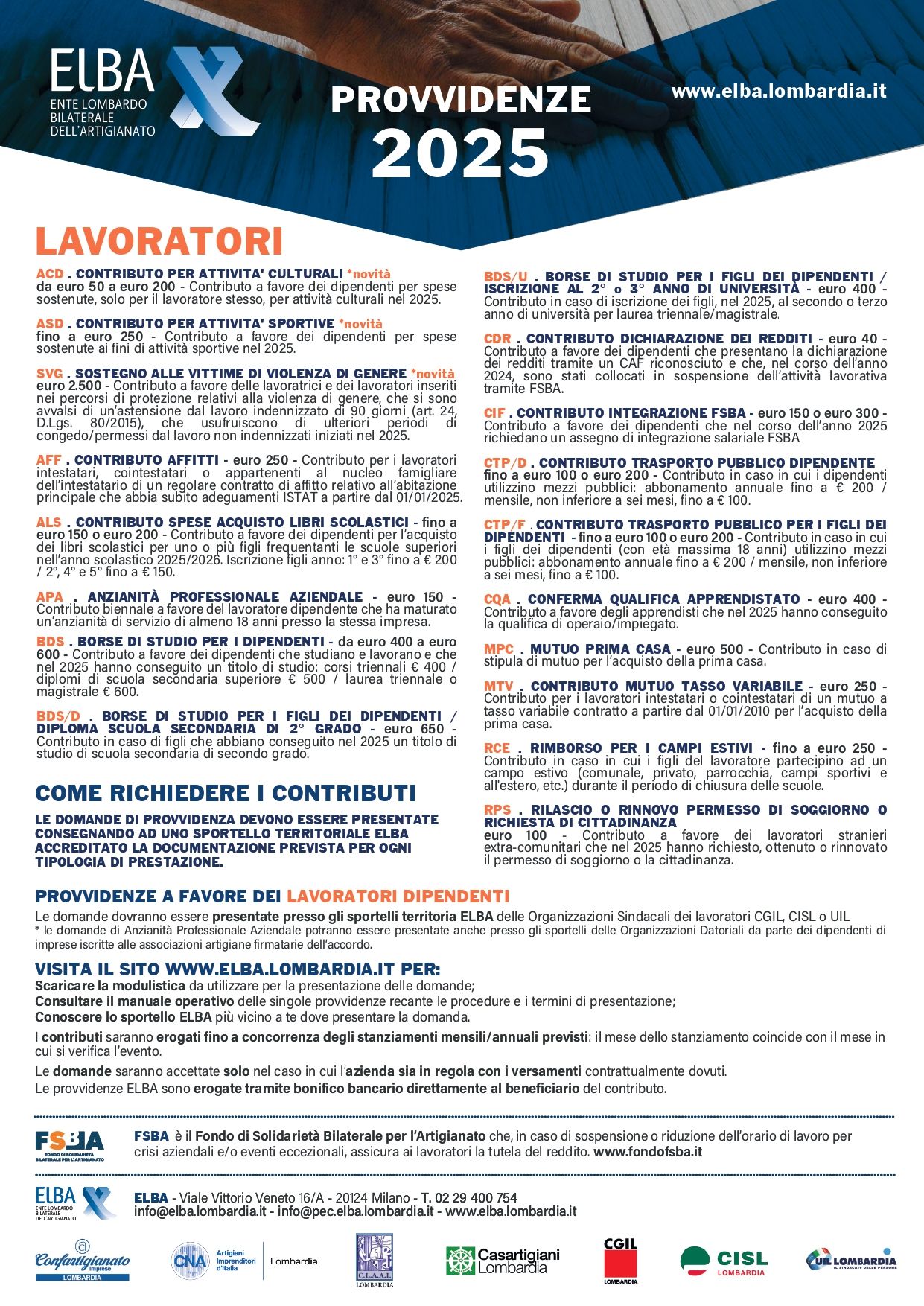 Lo Sportello ELBA di Confartigianato Imprese Sondrio fornisce informazioni sui servizi predisposti a favore delle aziende e dei loro dipendenti nonchè verifica e inoltra le richieste di contributo e/o sussidio all’Ente regionale.