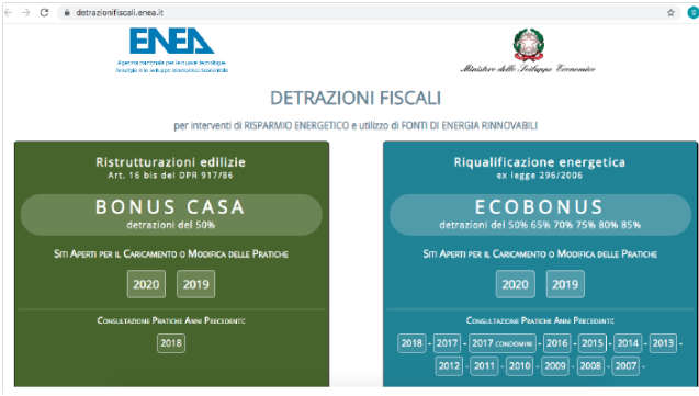 Il sito, disponibile dallo scorso 25 marzo 2020, permette di inviare i dati sugli interventi conclusi nel 2020 che danno diritto alle detrazioni fiscali per ECOBONUS, BONUS FACCIATE E BONUS CASA.