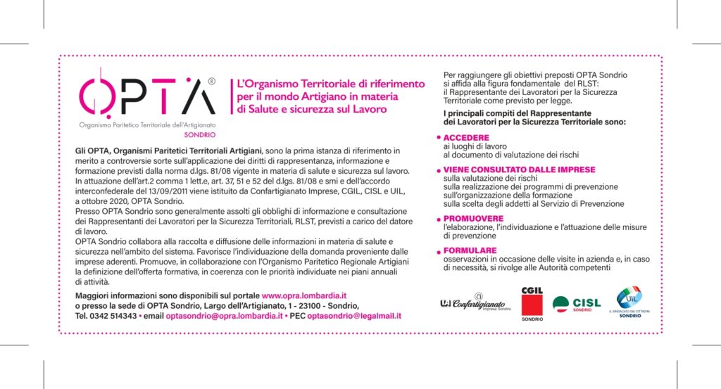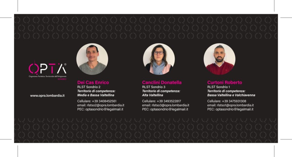 OPTA Sondrio viene coordinato da OPRA Lombardia per promuovere e realizzare l’attività sul territorio degli RLST come previsti dalla legge, dei comparti artigiani della meccanica, del tessile e della moda, della chimica e della ceramica, del legno e dei lapidei, dell’area comunicazione, dell’estetica, dei servizi di pulizia, dell’area autotrasporto, merci e logistica.