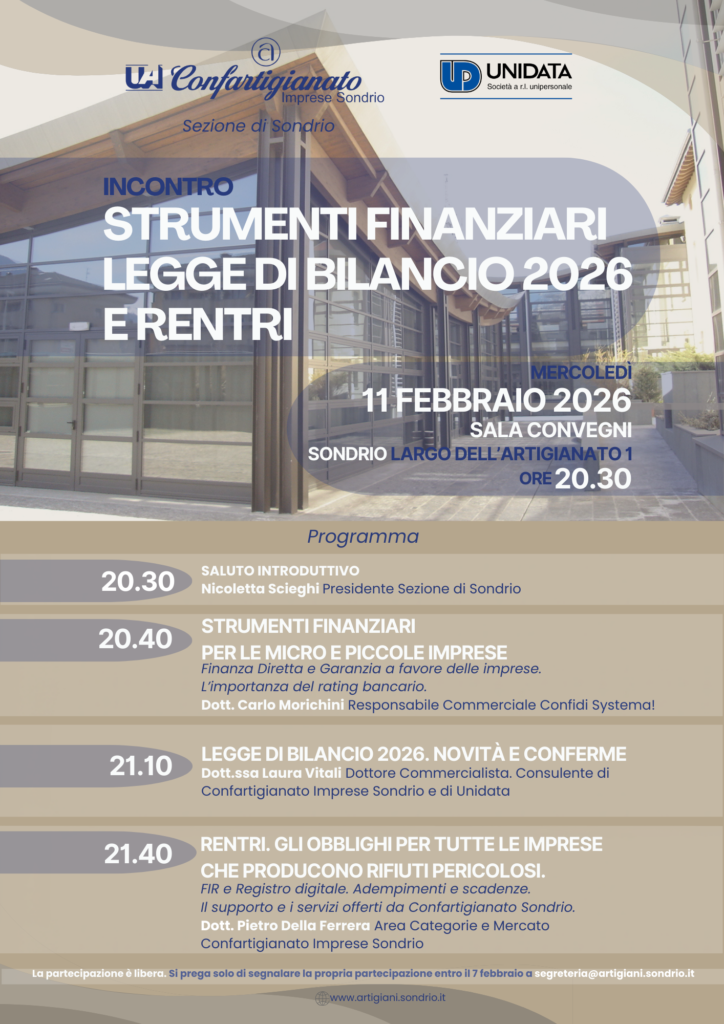 L’iniziativa, dal titolo “Strumenti finanziari, Legge di Bilancio 2026 e RENTRI”, rappresenta un’importante occasione di approfondimento su strumenti e novità normative che incidono direttamente sulla gestione e sullo sviluppo delle attività imprenditoriali.