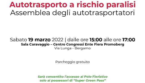 Gli autotrasportatori artigiani della provincia di Sondrio sono stati invitati a prendere parte alla manifestazione di Bergamo ; l’accesso al Polo Fieristico di Bergamo è consentito solo ai possessori di “Super Green Pass” e che il parcheggio è gratuito.
