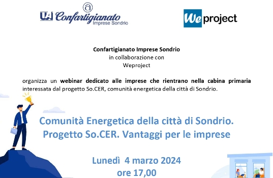Confartigianato Imprese Sondrio in collaborazione con Weproject organizza un webinar dedicato alle imprese che rientrano nella cabina primaria interessata dal progetto So.CER, comunità energetica della città di Sondrio.