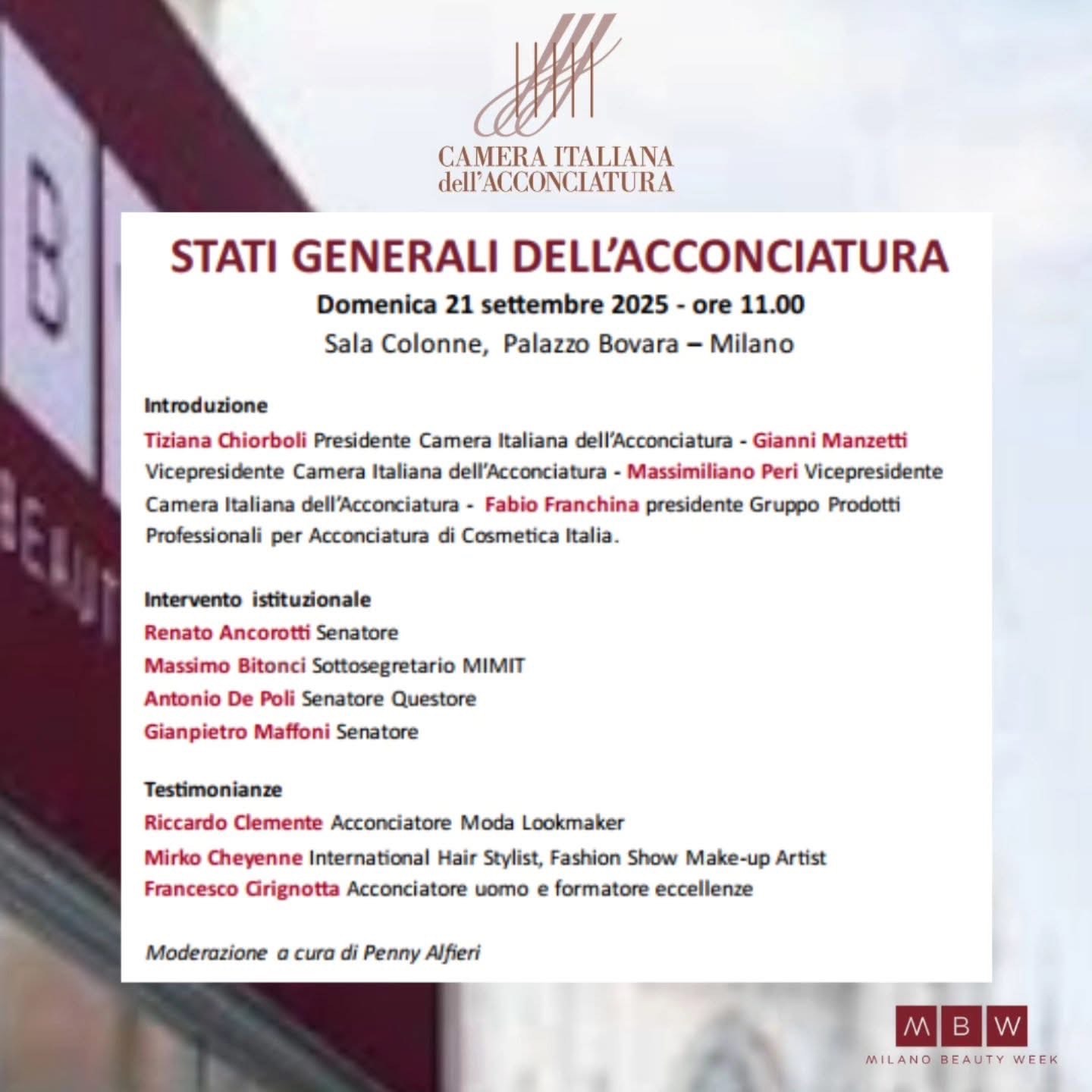 A discuterne saranno i rappresentanti della Camera Italiana dell’Acconciatura – la Presidente Tiziana Chiorboli, i Vicepresidenti Massimiliano Peri e Gianni Manzetti, e il Presidente del Gruppo Prodotti professionali per l’acconciatura di Cosmetica Italia, Fabio Franchina – insieme al Sottosegretario al MIMIT Massimo Bitonci, al Senatore Questore Antonio De Poli e ai Senatori Gianpietro Maffoni e Renato Ancorotti, quest’ultimo firmatario della proposta di legge sulla riforma della normativa di settore, presentata in Senato.