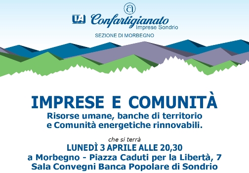 IMPRESE E COMUNITÀ Risorse umane, banche di territorio e Comunità energetiche rinnovabili che si terrà LUNEDÌ 3 APRILE ALLE 20,30 a Morbegno – Piazza Caduti per la Libertà, 7 Sala Convegni Banca Popolare di Sondrio