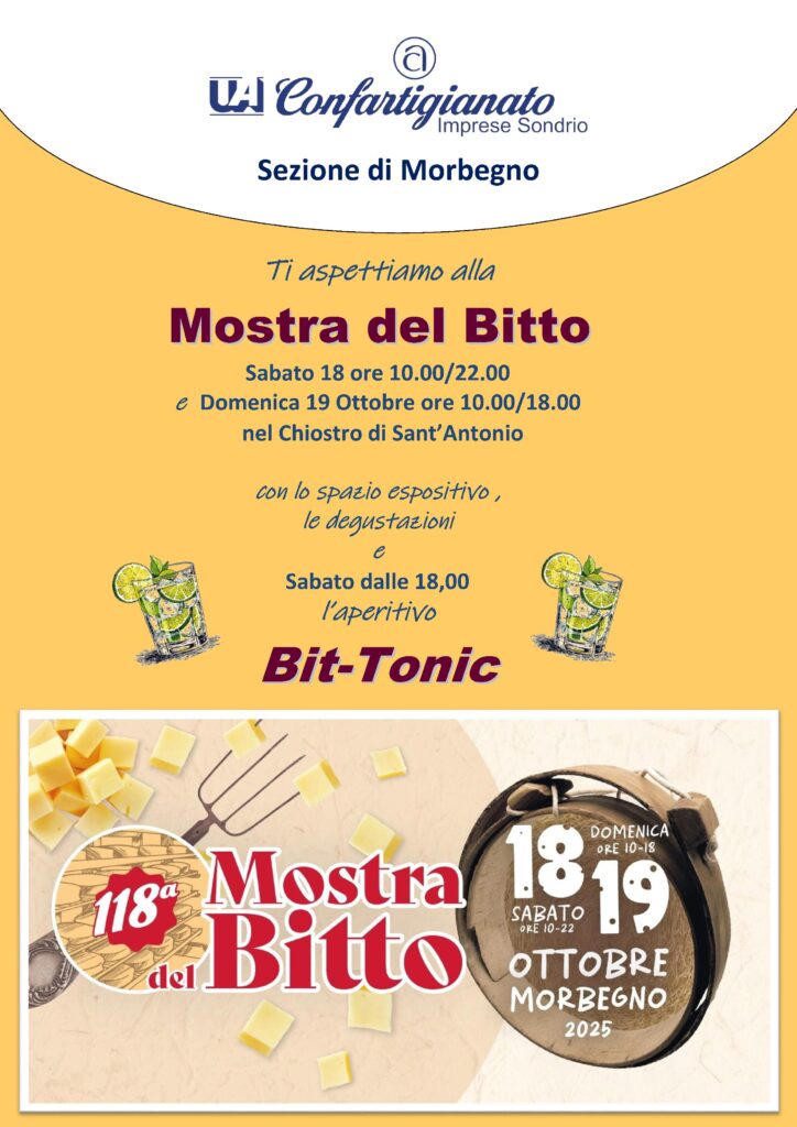 Confartigianato Imprese Sondrio – Sezione di Morbegno ti aspetta alla 118^ Mostra del Bitto, sabato 18 e domenica 19 ottobre 2025 con lo spazio espositivo, le degustazioni e, sabato alle 18:00, l’aperitivo Bit-Tonic