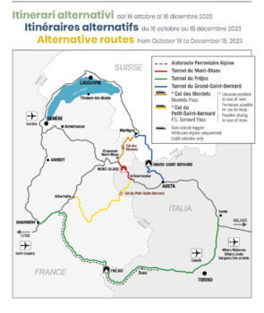I percorsi alternativi indicati per i veicoli leggeri sono il traforo del Gran San Bernardo e, fino a quando non sarà chiuso per l’arrivo della stagione invernale, il passo del Piccolo San Bernardo.