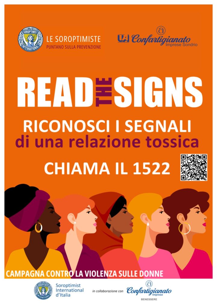 Prende il via anche sul territorio della provincia di Sondrio l’impegno congiunto di Soroptimist International d’Italia e Confartigianato Benessere nella promozione di iniziative di sensibilizzazione contro la violenza sulle donne. In occasione della Giornata Internazionale contro la violenza sulle donne del 25 novembre scorso, le rappresentanze provinciali delle due realtà hanno subito accolto e rilanciato il progetto “Read the Sign”, promuovendo la diffusione capillare di una locandina informativa.